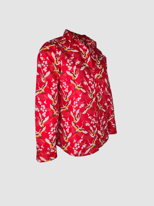 Camisa Roja Manga Larga Estampado de Grullas y Flores