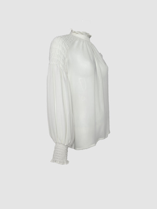 Blusa Blanca Manga Larga con Pliegues en Hombros